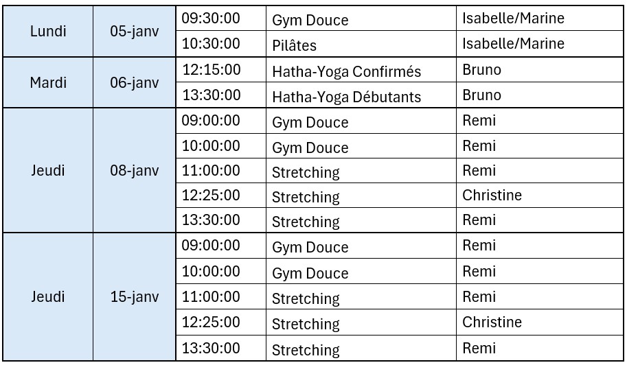 Hormis les cours effectués au gymnase ROUSSEAU qui, en raison des vœux du Maire, sera indisponible du lundi 05 au samedi 17 janvier 2026 INCLUS.